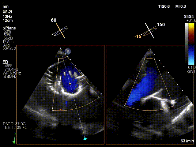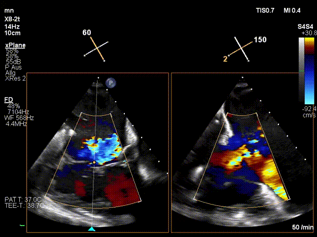 手術(shù)在全麻狀態(tài)下進(jìn)行。在加拿大圣保羅醫(yī)院的Anson Cheung教授的指導(dǎo)參與下,術(shù)者采用經(jīng)右側(cè)頸靜脈入路的方式將輸送器送入患者心臟內(nèi),在TEE及DSA引導(dǎo)下調(diào)整輸送器頭端角度,使得輸送器與三尖瓣瓣環(huán)平面垂直。在輸送器進(jìn)入右心室后釋放室間隔錨定裝置,而后釋放瓣葉夾持件(2個(gè)耳片結(jié)構(gòu))成垂直狀態(tài)。在TEE及DSA確定夾持件固定至三尖瓣葉根部且位于右室側(cè)后釋放人工瓣心房側(cè)盤片。隨后調(diào)整瓣膜同軸性以及室間隔錨定件位置(貼合室間隔),前推藏針管并固定,進(jìn)而釋放室間隔錨定裝置,并再次確認(rèn)瓣膜位置、穩(wěn)定性及同軸性,合攏輸送鞘后撤出輸送器,完成LuX-Valve Plus人工三尖瓣瓣膜的植入。