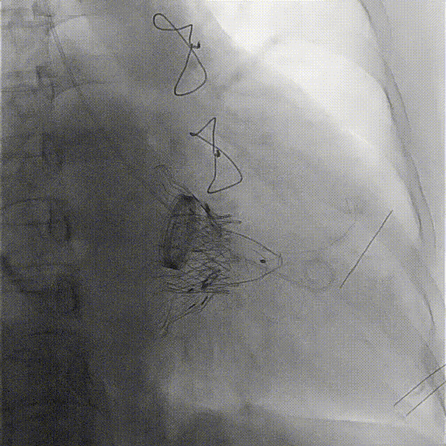 手術在全麻狀態(tài)下開展,海軍軍醫(yī)大學附屬長海醫(yī)院陸方林教授與廈門心血管病醫(yī)院王焱院長共同上臺,為患者進行手術。此次手術采用經(jīng)右側(cè)頸靜脈入路的方式將輸送器送入患者心臟內(nèi),在TEE及DSA引導下調(diào)整輸送器頭端角度,使得輸送器與三尖瓣瓣環(huán)平面垂直。在輸送器進入右心室后釋放室間隔錨定裝置,而后釋放瓣葉夾持件(2個耳片結(jié)構)成垂直狀態(tài)。在TEE及DSA確定夾持件固定至三尖瓣葉根部且位于右室側(cè)后釋放人工瓣心房側(cè)盤片。隨后調(diào)整瓣膜同軸性以及室間隔錨定件位置(貼合室間隔),前推藏針管并固定,進而釋放室間隔錨定裝置,并再次確認瓣膜位置、穩(wěn)定性及同軸性,合攏輸送鞘后撤出輸送器,完成LuX-Valve Plus人工三尖瓣瓣膜的植入。