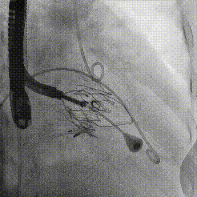手術(shù)在全麻狀態(tài)下開(kāi)展,此次手術(shù)采用經(jīng)頸靜脈入路的方式。在TEE及DSA雙重引導(dǎo)下,術(shù)者調(diào)整輸送器頭端角度使得其與三尖瓣瓣環(huán)平面垂直。在輸送器進(jìn)入右心室后釋放室間隔錨定裝置,而后釋放瓣葉夾持件(2個(gè)耳片結(jié)構(gòu))成垂直狀態(tài)。在TEE及DSA確定夾持件固定至三尖瓣葉根部且位于右室側(cè)后釋放人工瓣心房側(cè)盤(pán)片。隨后調(diào)整瓣膜同軸性以及室間隔錨定件位置(貼合室間隔),進(jìn)而釋放室間隔錨定裝置,并再次確認(rèn)瓣膜位置、穩(wěn)定性及同軸性,解離人工瓣膜與輸送器間連接,并撤出輸送器,完成了LuX-Valve Plus人工三尖瓣瓣膜的植入。