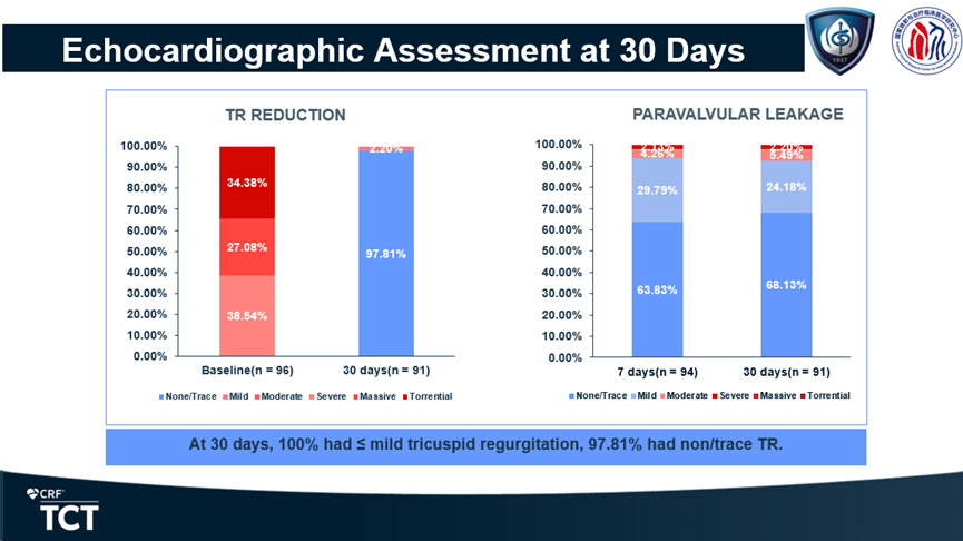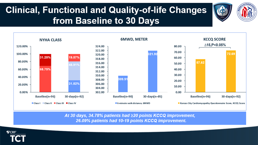 100%患者三尖瓣反流降低至輕度及以下,97.81%患者顯示無(wú)或僅微量瓣周漏 在美國(guó)紐約心臟協(xié)會(huì)(NYHA)心功能改善和生活質(zhì)量評(píng)分方面,80.43%患者由術(shù)前NYHA Ⅲ/Ⅳ級(jí)提升至Ⅰ/Ⅱ級(jí),34.78%患者KCCQ評(píng)分提升≥20分,26.09%患者提升10~19分