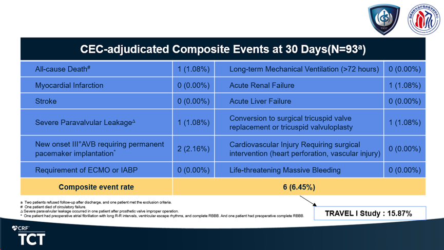 TRAVEL Ⅱ是一項(xiàng)前瞻性、多中心、單臂臨床試驗(yàn),主要用于評(píng)估LuX-Valve Plus在重度三尖瓣反流患者中應(yīng)用的長(zhǎng)期安全性和有效性。TRAVELⅡ臨床試驗(yàn)已納入中國(guó)15家中心的96例患者,所發(fā)布的一個(gè)月臨床數(shù)據(jù)主要終點(diǎn)為手術(shù)后30天復(fù)合事件發(fā)生率。