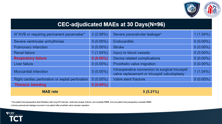 心肌梗死、卒中、使用ECMO或IABP、急性肝功能衰竭、長(zhǎng)期機(jī)械通氣(>72小時(shí))、需要外科干預(yù)的心血管損傷(心臟穿孔、血管損傷)、危及生命的大出血事件發(fā)生率均為0全因死亡率僅為1.08%(與器械無(wú)關(guān)) 急性腎臟衰竭、重度瓣周漏和中轉(zhuǎn)外科三尖瓣置換或成形術(shù)發(fā)生率均僅為1.08%新發(fā)Ⅲ度房室傳導(dǎo)阻滯需植入永久心臟起搏器發(fā)生率僅為2.16%
