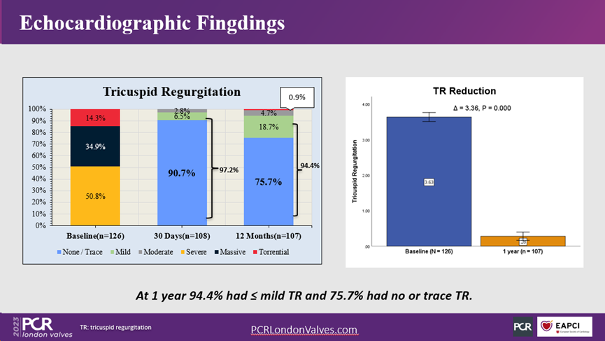 LuX-Valve經(jīng)導(dǎo)管三尖瓣置換系統(tǒng)可顯著降低三尖瓣反流,改善患者心功能和提高患者生活質(zhì)量。其中超聲數(shù)據(jù)顯示,99.1%的患者三尖瓣反流等級(jí)得到改善,94.4%的患者三尖瓣反流分級(jí)降低至輕度及以下,75.7%的患者恢復(fù)至無(wú)/微量三尖瓣反流。一年隨訪數(shù)據(jù)呈現(xiàn)了良好的安全性與有效性。