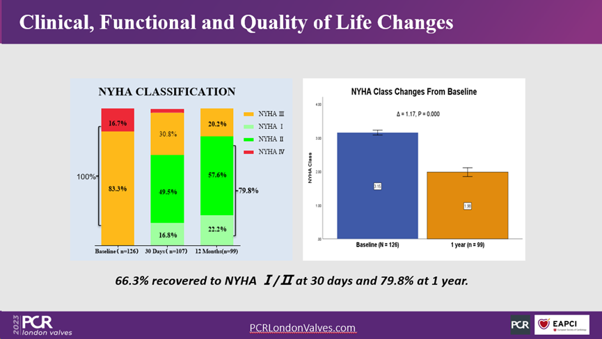 30天有效性結(jié)果顯示,100%患者三尖瓣反流降低至輕度及以下,97.81%患者顯示無(wú)/微量瓣周漏。在NYHA心功能改善和生活質(zhì)量評(píng)分方面,80.43%患者由術(shù)前NYHAⅢ/Ⅳ級(jí)提升至Ⅰ/Ⅱ級(jí),34.78%患者KCCQ(堪薩斯城心肌病患者生活質(zhì)量量表)評(píng)分提升≥20分,26.09%患者提升10~19分。