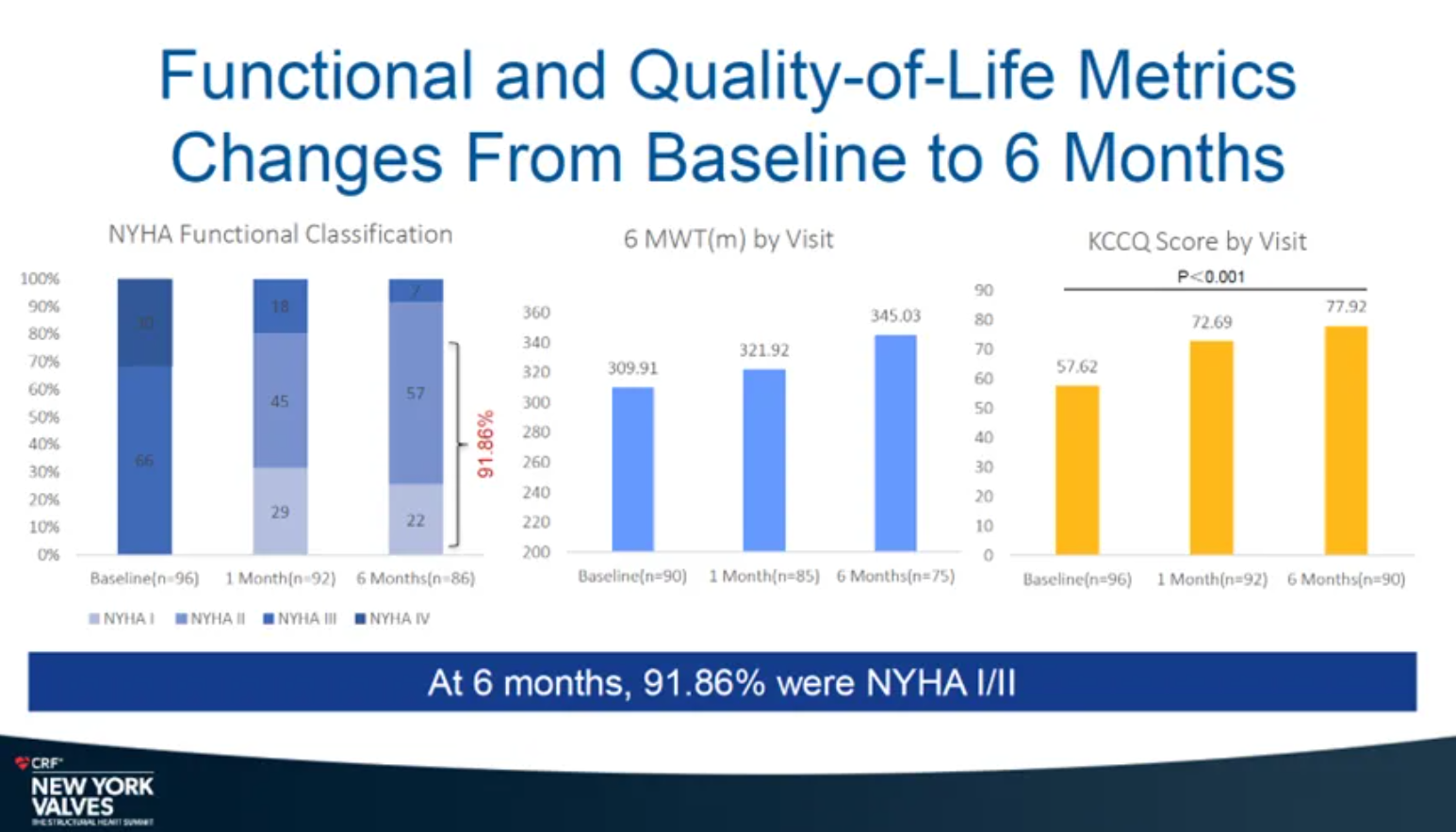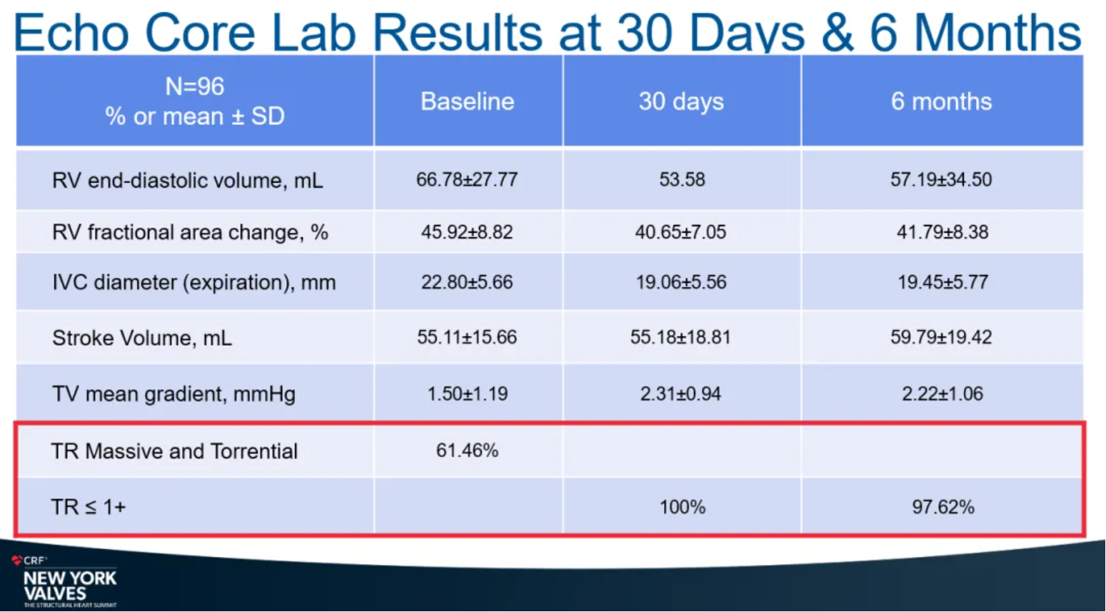 有效性結(jié)果顯示,患者的反流等級(jí)、心功能等級(jí),以及生活質(zhì)量顯著改善。100%的患者在30天顯示無中度及以上反流,97.62%的患者在6個(gè)月時(shí)顯示無中度及以上反流。同時(shí),根據(jù)超聲數(shù)據(jù)顯示,患者右心系統(tǒng)重構(gòu)也獲得受益。
