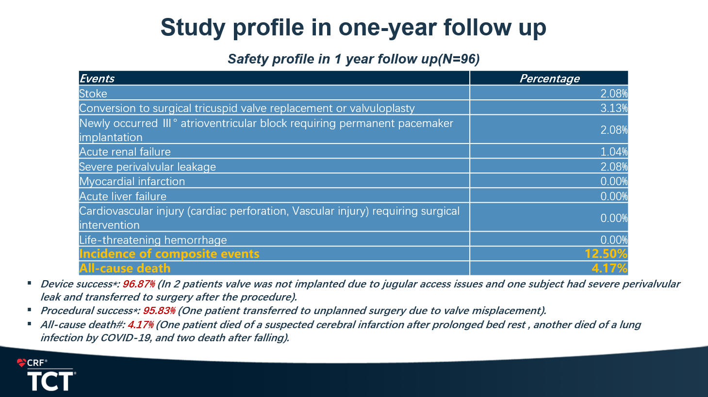 安全性結(jié)果顯示,復(fù)合事件發(fā)生率為12.50%。心梗、使用ECMO(體外膜肺氧合)或IABP(主動脈內(nèi)球囊反搏)、急性肝功能衰竭、長期機(jī)械通氣(>72小時)、需要外科干預(yù)的心血管損傷(心臟穿孔、血管損傷)、危及生命的大出血事件發(fā)生率均未發(fā)生。全因死亡率僅為4.17%,急性腎臟衰竭、重度瓣周漏和中轉(zhuǎn)外科三尖瓣置換或成形術(shù)發(fā)生率分別為1.04%、2.08%和3.13%。新發(fā)III度房室傳導(dǎo)阻滯需植入永久心臟起搏器的發(fā)生率僅2.08%。