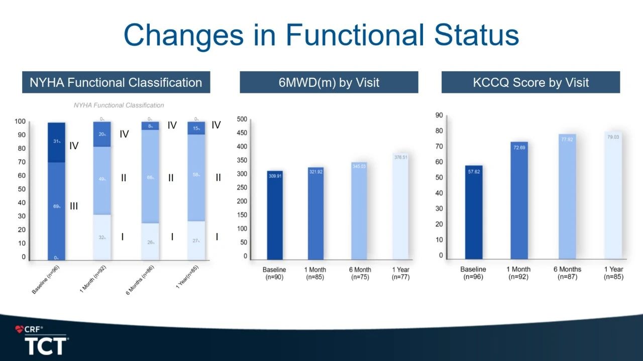 NYHA心功能改善方面,30天數(shù)據(jù)顯示約80%的患者由術(shù)前 III/IV 級提升至 I/II 級,1年期數(shù)據(jù)顯示約85%的患者由術(shù)前 III/IV 級提升至 I/II 級。在生活質(zhì)量方面,患者堪薩斯城心肌病變問卷(KCCQ)評分在30天平均提升15分,在1年期平均提升21分。有效性結(jié)果顯示患者的心功能和生活質(zhì)量持續(xù)改善。