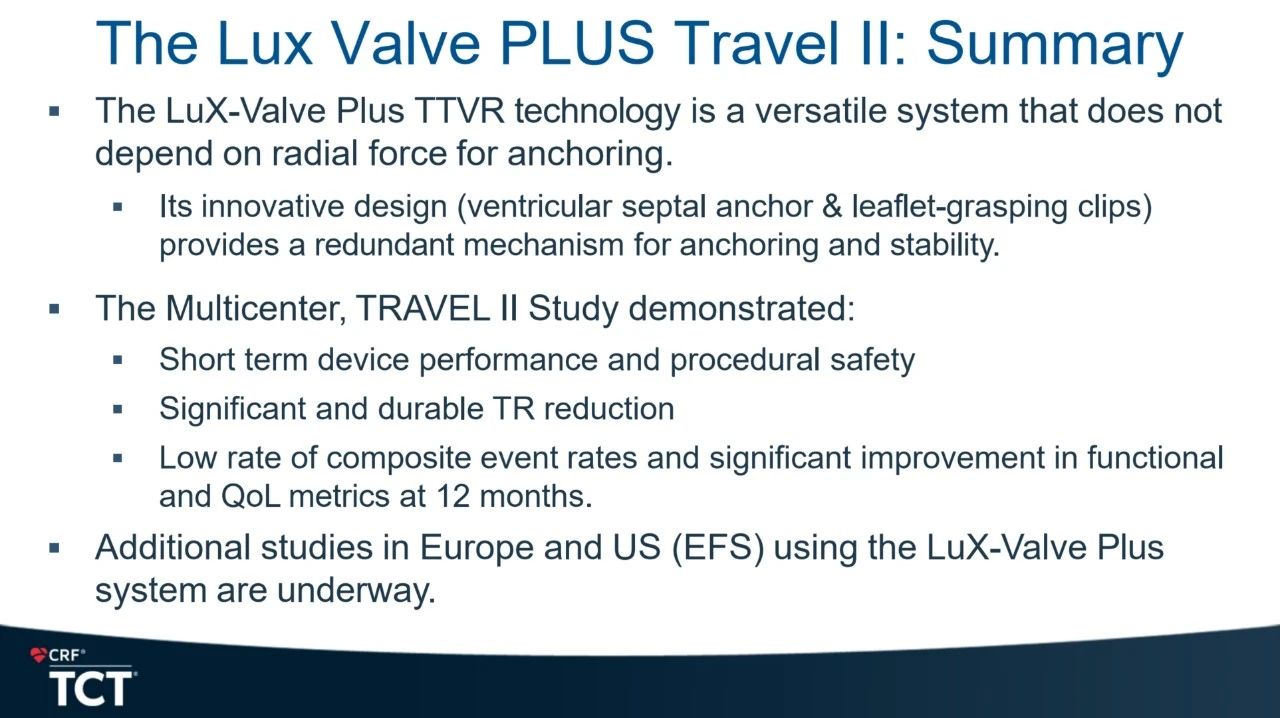 Granada教授表示,LuX-Valve Plus 是一款不依賴于徑向支撐力固定的多功能 TTVR 器械,它的創(chuàng)新設(shè)計(室間隔錨定和瓣葉夾持件)提供了多樣的固定和穩(wěn)定技術(shù)。多中心臨床試驗研究 TRAVEL II 展現(xiàn)了 LuX-Valve Plus 的安全性和有效性,能實現(xiàn)較短的器械操作時間,較低的復(fù)合事件發(fā)生率。1年期的數(shù)據(jù)延續(xù)了6個月數(shù)據(jù)的優(yōu)異結(jié)果,顯示了其長久的可靠性,尤其是1年期時顯著降低三尖瓣返流等級,以及帶來心功能和生活質(zhì)量等指標(biāo)的明顯改善。