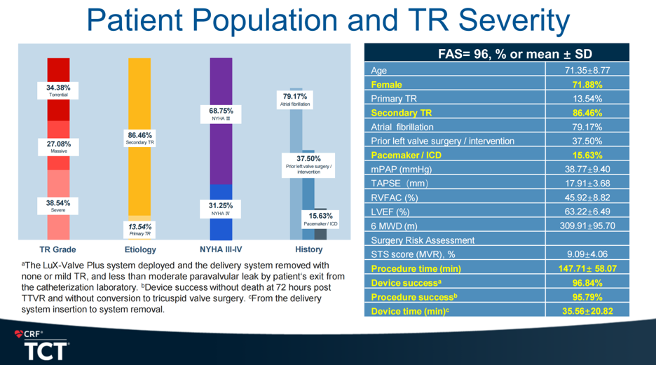 10月29日,本次 TCT 2024 會議的結(jié)構(gòu)心日程中,來自美國心血管研究基金會(Cardiovascular Research Foundation, New York, U.S.)的Juan F. Granada教授攜手中山醫(yī)院葛均波院士團(tuán)隊一同正式公布了 LuX-Valve Plus TRAVEL II 確證性臨床研究的1年期試驗(yàn)結(jié)果。