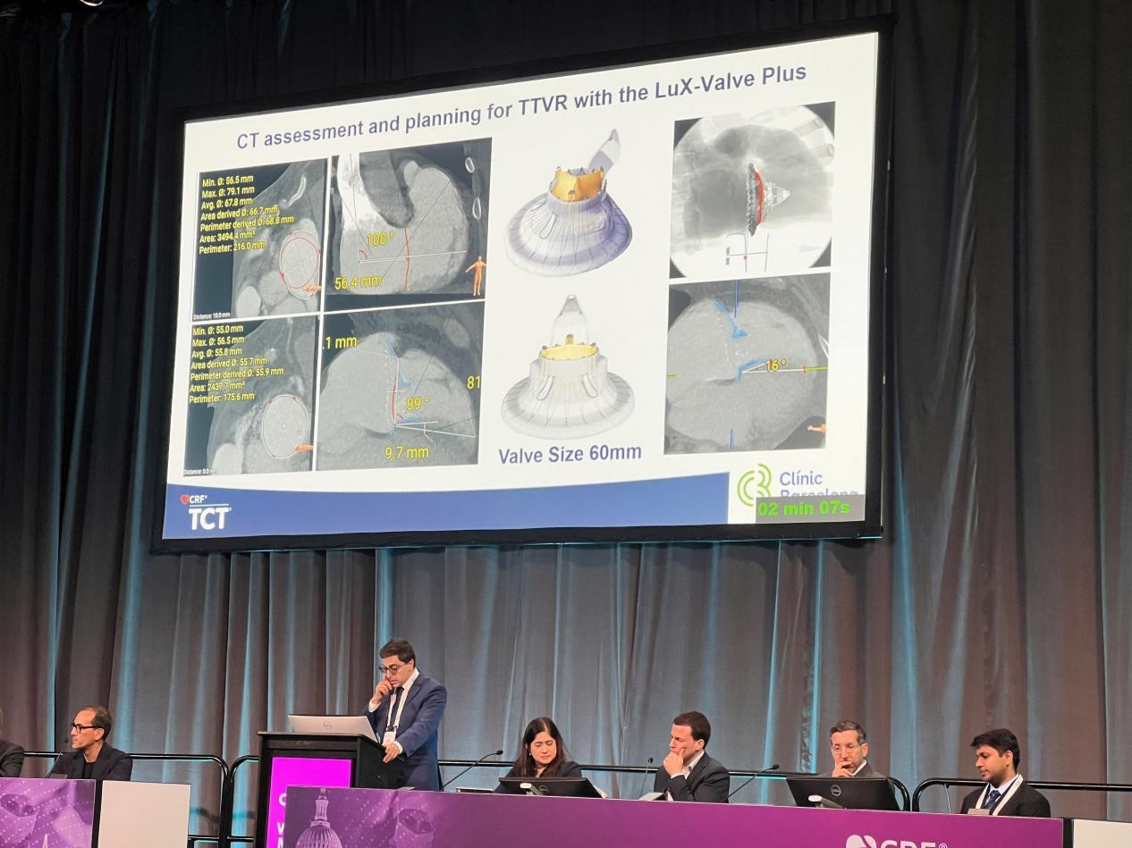 除了公布1年期數(shù)據(jù)以外,來自巴塞羅那臨床中心醫(yī)院(Clinic Barcelona)的Omar Abdul-Jawad Altisent博士還進(jìn)行了一個病例報告的分享。一名 59 歲男性患者有高血壓、肥胖、A型肝炎,永久性房顫等病史,同時患有三尖瓣心內(nèi)膜炎伴隨三尖瓣返流,右心衰,膿毒性肺栓塞,肺氣腫并需要長期待在 ICU。根據(jù)巴塞羅那臨床中心醫(yī)院治療三尖瓣返流的規(guī)則,因?yàn)椴荒芙邮艿母唢L(fēng)險患者首先拒絕了開胸手術(shù)這個選項(xiàng);隨后在評估是選擇修復(fù)還是置換路徑的時候,由于患者瓣環(huán)擴(kuò)張嚴(yán)重而且中間有較大開口,因此在CT評估決定后,該中心選擇 LuX-Valve Plus 系統(tǒng)進(jìn)行三尖瓣置換手術(shù)。術(shù)后 30天隨訪顯示,所有功能性和生活質(zhì)量指標(biāo)都有提升,心功能從原來的 NYHA III 級回到 I/II 級,KCCQ 評分提升37分;6個月期隨訪數(shù)據(jù)顯示心功能改善至 NYHA I 級,KCCQ 評分提升42分。最后,Omar博士總結(jié)道,這是第一例成功用于患有心內(nèi)膜炎,嚴(yán)重?zé)o菌性贅生物以及晚期右心衰竭的患者的經(jīng)皮的三尖瓣置換手術(shù)。LuX-Valve Plus 獨(dú)特的設(shè)計,包括室間隔錨定,40-70mm可選的多樣型號,讓這款產(chǎn)品能應(yīng)對各種非常挑戰(zhàn)的三尖瓣解剖結(jié)構(gòu)。